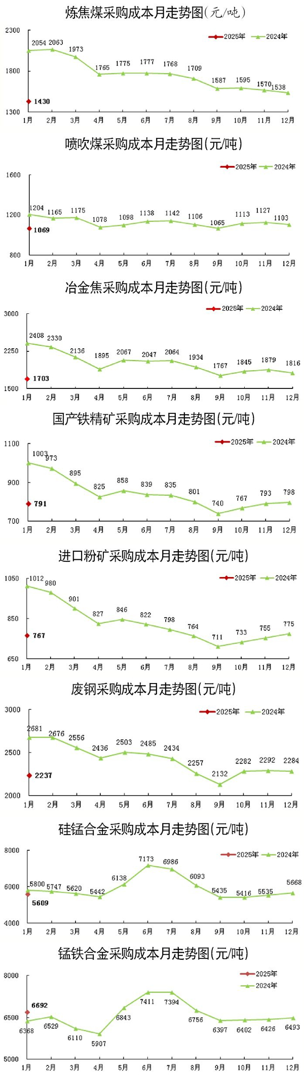 1月份,“對標挖潛”企業主要原燃材料各品種采購成本環比以降低為主,煤焦類品種降幅較大。