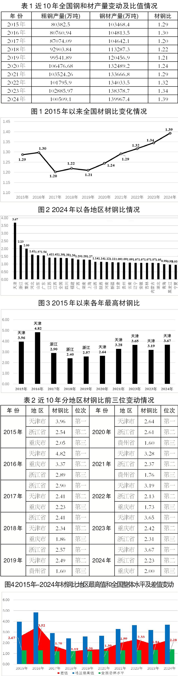 2015年—2024年10年間材鋼比的地區最高值與同期全國材鋼比總體水平間的差值各不相同。其中,2016年最大,為3.52;2018年最小,為1.19。