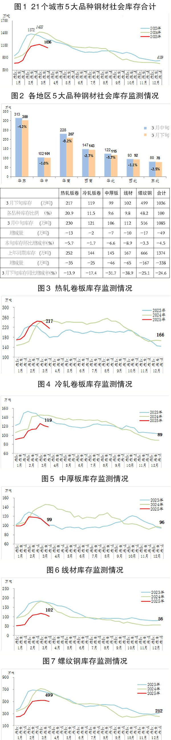 3月下旬,21個城市5大品種鋼材社會庫存為1036萬噸,環比減少49萬噸,下降4.5%,庫存繼續下降;比今年初增加377萬噸,上升57.2%;比上年同期減少338萬噸,下降24.6%。