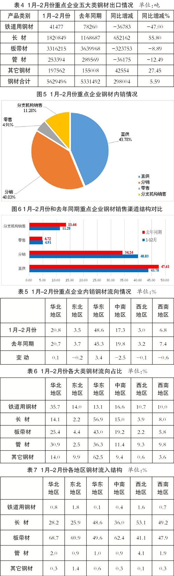 內銷鋼材量中,通過直供、分銷、零售、分支機構渠道銷售的鋼材量占內銷總量的比例分別為43.8%、40.0%、4.9%、11.3%。和去年同期相比,1月—2月份重點企業通過直供和分支機構渠道銷售的占比分別下降3.8個和2.2個百分點,通過分銷和零售渠道銷售的占比分別提升5.8個和0.2個百分點。