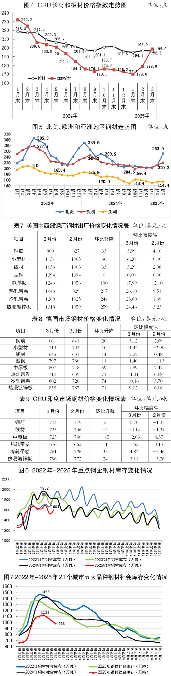 3月份,CRU長材指數為196.5點,環比下降0.4點、降幅為0.2 %;CRU板材指數為199.0點,環比上升20.0點、升幅為11.2%。CRU長材指數同比下降20.9點、降幅為9.6%;CRU板材指數同比下降7.6點、降幅為3.7%。