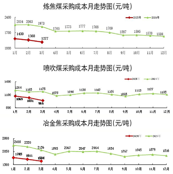 3月份,煉焦煤加權平均折算成幹基的采購成本為1276.70元/噸,環比減少91.18元/噸,下降6.67%;第1季度累計平均折算成幹基的采購成本為1358.28元/噸,同比減少678.76元/噸,下降33.32%。