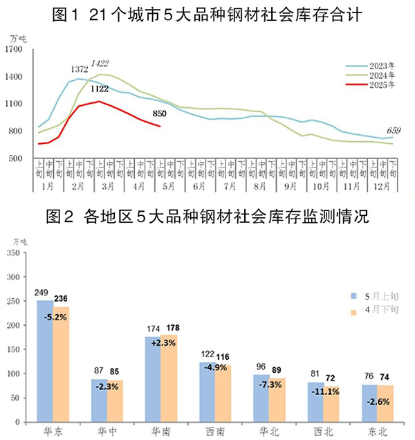 5月上旬,21個城市5大品種鋼材社會庫存為850萬噸(見圖1),環比減少35萬噸,下降4.0%,庫存降幅略有收窄;比今年初增加191萬噸,上升29.0%;比去年同期減少305萬噸,下降26.4%。