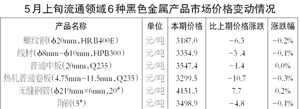 5月上旬6種黑色金屬產品價格環比“四降一升一平”
