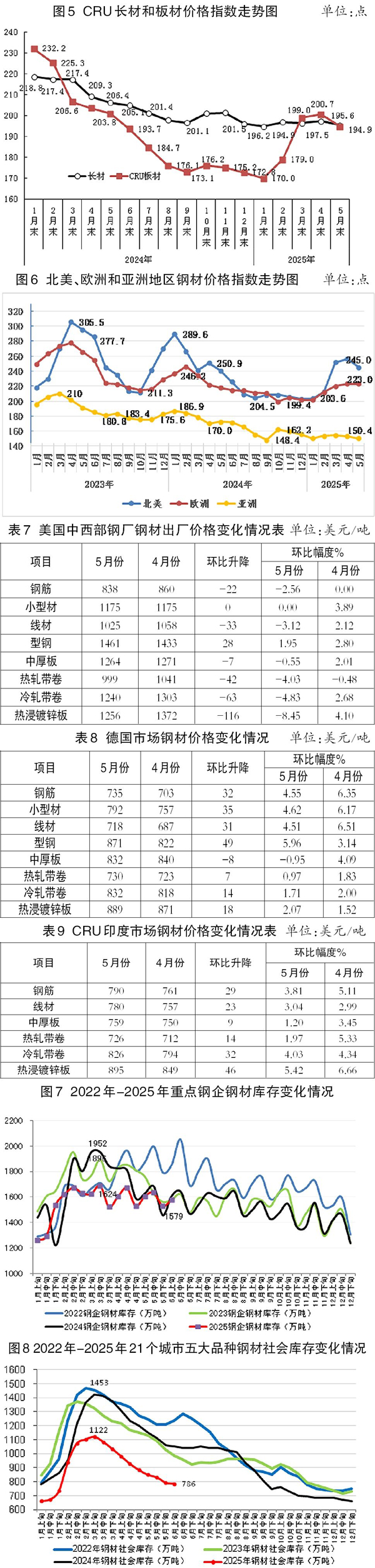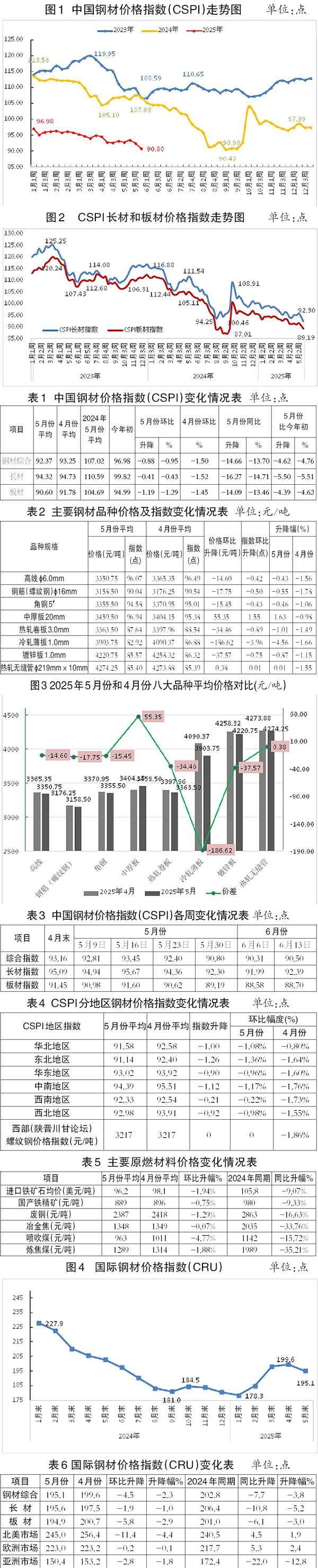 5月份,CRU長材指數為195.6點,環比下降1.9點、降幅為1.0%,CRU板材指數為194.9點,環比下降5.8點、降幅為2.9%。與去年同期相比,5月份CRU長材指數下降10.8點、降幅為5.2%,CRU板材指數下降6.1點、降幅為3.0 %。