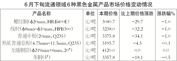 6月下旬6種黑色金屬產品市場價格環比“五降一持平”