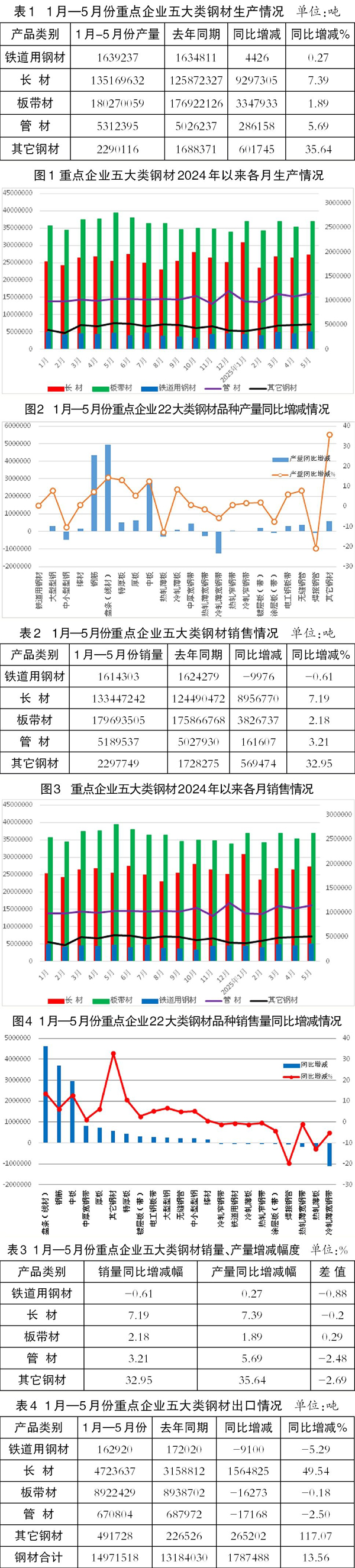 1月—5月份,全國累計生產粗鋼4.3億噸,同比下降1.7%,累計日產285.9萬噸;生產鋼材6.1億噸,同比增長5.2%,累計日產401.2萬噸。納入營銷月報統計的重點統計鋼鐵企業(下稱重點企業)生產鋼材3.3億噸,同比增長4.4%。重點企業銷售鋼材3.2億噸,同比增長4.4%,與產量增幅相當。