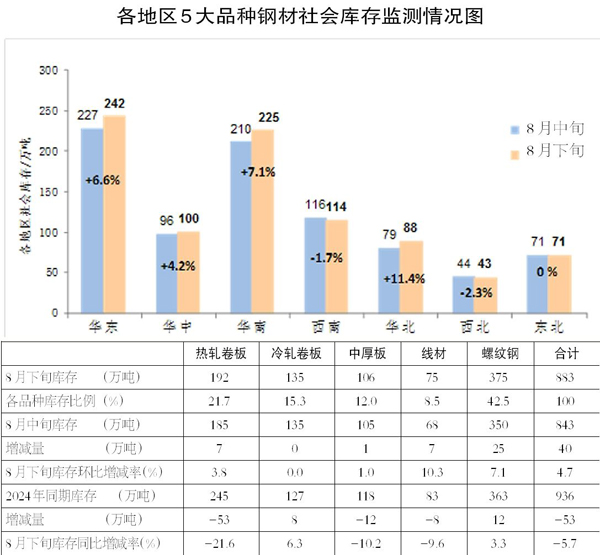 8月下旬,分地區來看,7大區域鋼材社會庫存各有升降,其中華東地區和華南地區為增量最大地區,華北地區為增幅最大地區,具體情況見圖。