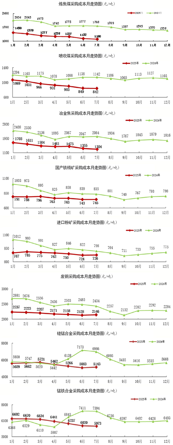 7月份,冶金焦加權平均折算成幹基的采購成本為1303.66元/噸,環比減少51.49元/噸,下降3.80%;1月—7月份累計平均折算成幹基的采購成本為1482.27元/噸,同比減少646.01元/噸,下降30.35%。