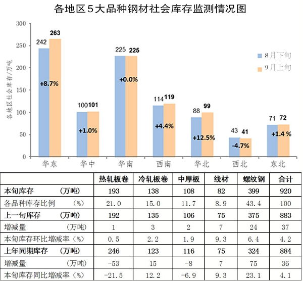 9月上旬,分地區來看,7大區域的鋼材社會庫存,除西北地區環比下降、華南地區環比持平外,其他區域均有所上升。其中,華東地區為增量最大地區,華北地區為增幅最大地區,具體情況見圖。