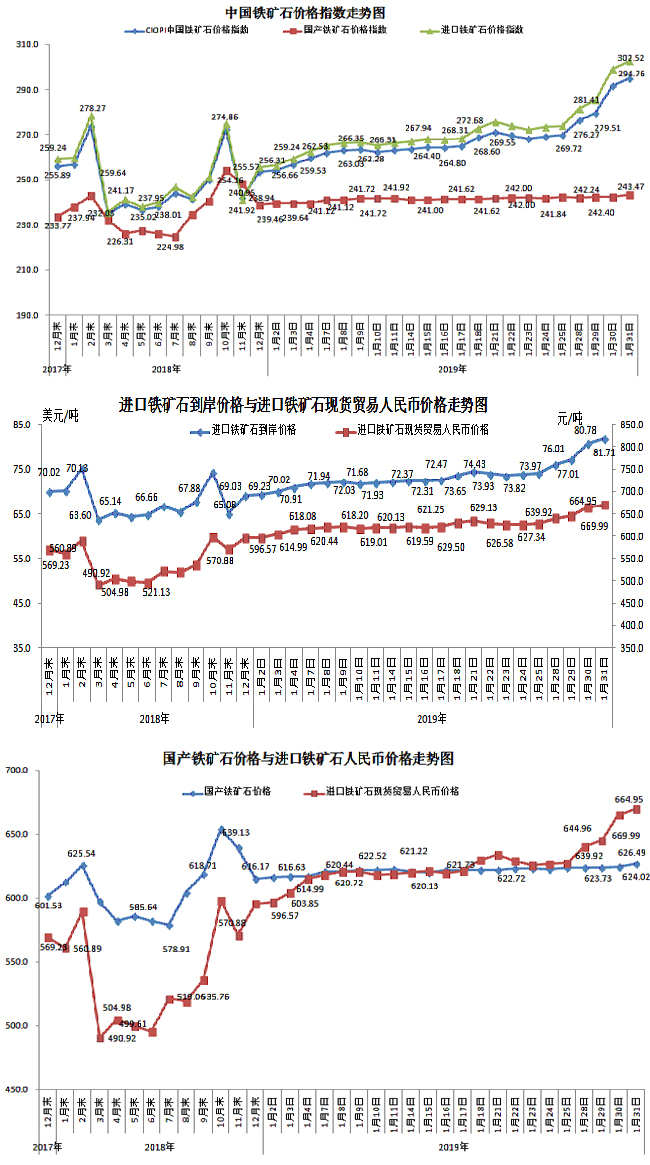 1月31日,中國鐵礦石價格指數(CIOPI)294.76點,環比上升3.12點,升幅為1.07%。其中:國產鐵礦石價格指數為243.47點,環比上升0.96點,升幅為0.40%;進口鐵礦石價格指數為302.52點,環比上升3.44點,升幅為1.15%。