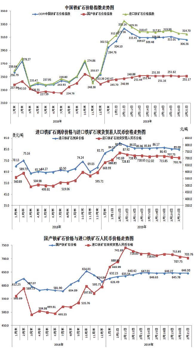 2月21日,中國鐵礦石價格指數(CIOPI)306.36點,環比下降1.20點,降幅為0.39%。其中:國產鐵礦石價格指數為251.17點,環比上升0.20點,升幅為0.08%;進口鐵礦石價格指數為314.70點,環比下降1.41點,降幅為0.45%。