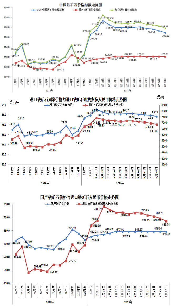 2月25日,中國鐵礦石價格指數(CIOPI)299.23點,環比下降3.78點,降幅為1.25%。其中:國產鐵礦石價格指數為251.10點,環比下降0.07點,降幅為0.03%;進口鐵礦石價格指數為308.33點,環比下降4.48點,降幅為1.43%。