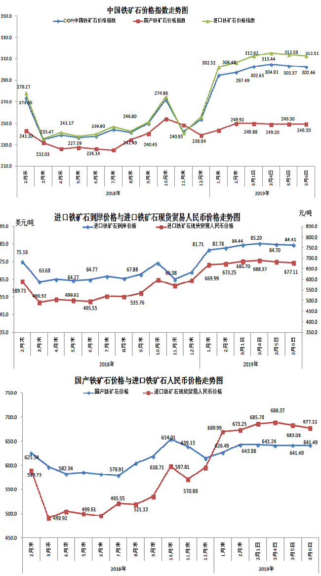 3月6日,中國鐵礦石價格指數(CIOPI)302.46點,環比下降0.90點,降幅為0.30%。其中:國產鐵礦石價格指數為249.30點,環比持平;進口鐵礦石價格指數為312.51點,環比下降1.07點,降幅為0.34%。
