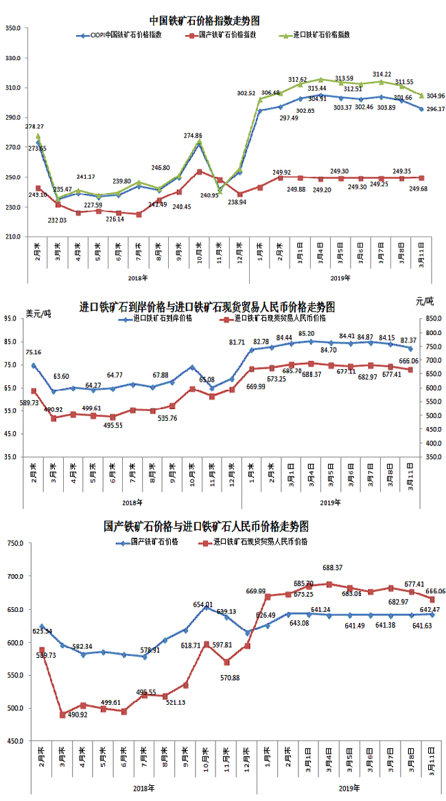 3月11日,中國鐵礦石價格指數(CIOPI)296.17點,環比下降5.49點,降幅為1.82%。其中:國產鐵礦石價格指數為249.68點,環比上升0.33點,升幅為0.13%;進口鐵礦石價格指數為304.96點,環比下降6.59點,降幅為2.12%。