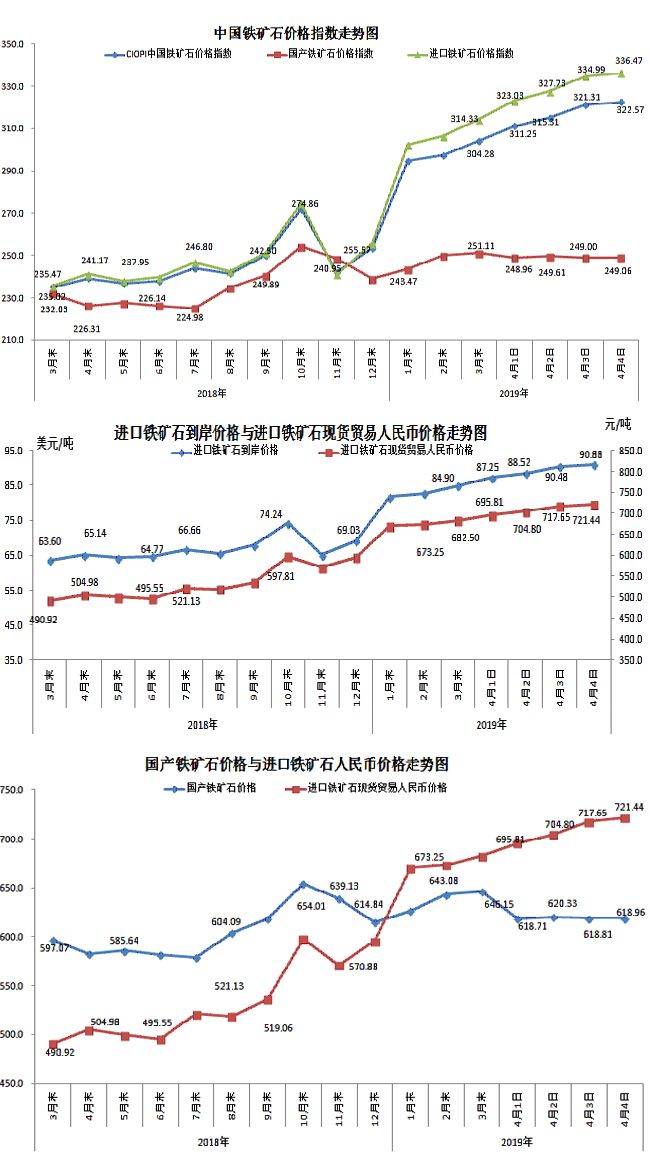4月4日,中國鐵礦石價格指數(CIOPI)322.57點,環比上升1.25點,升幅為0.39%。其中:國產鐵礦石價格指數為249.06點,環比上升0.06點,升幅為0.02%;進口鐵礦石價格指數為336.47點,環比上升1.48點,升幅為0.44%。