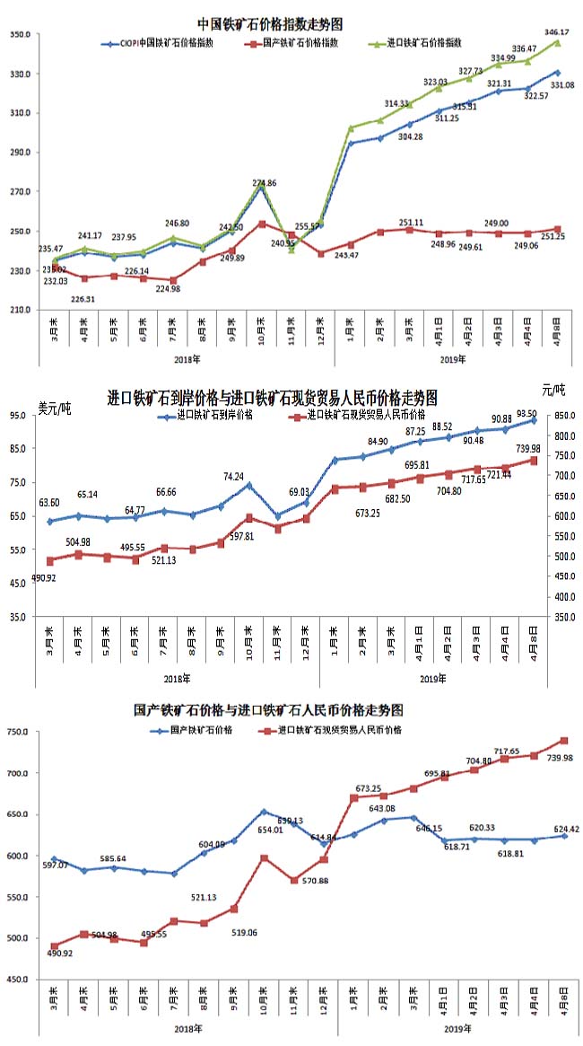 4月8日,中國鐵礦石價格指數(CIOPI)331.08點,環比上升8.51點,升幅為2.64%。其中:國產鐵礦石價格指數為251.25點,環比上升2.20點,升幅為0.88%;進口鐵礦石價格指數為346.17點,環比上升9.70點,升幅為2.88%。