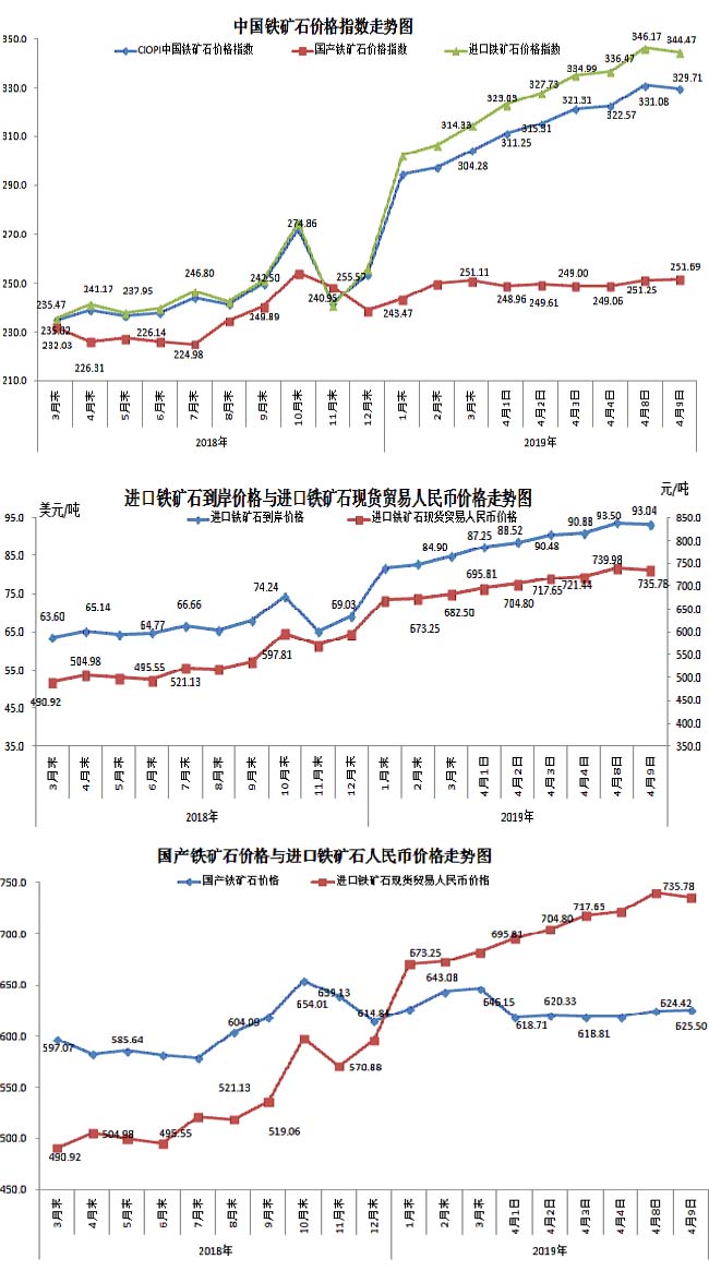 4月9日,中國鐵礦石價格指數(CIOPI)329.71點,環比下降1.36點,降幅為0.41%。其中:國產鐵礦石價格指數為251.69點,環比上升0.44點,升幅為0.17%;進口鐵礦石價格指數為344.47點,環比下降1.70點,降幅為0.49%。