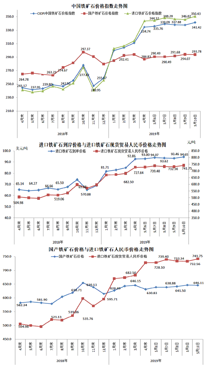 5月10日,中國鐵礦石價格指數(CIOPI)341.42點,環比上升3.66點,升幅為1.08%。其中:國產鐵礦石價格指數為293.78點,環比下降0.29點,降幅為0.10%;進口鐵礦石價格指數為350.43點,環比上升4.41點,升幅為1.27%。