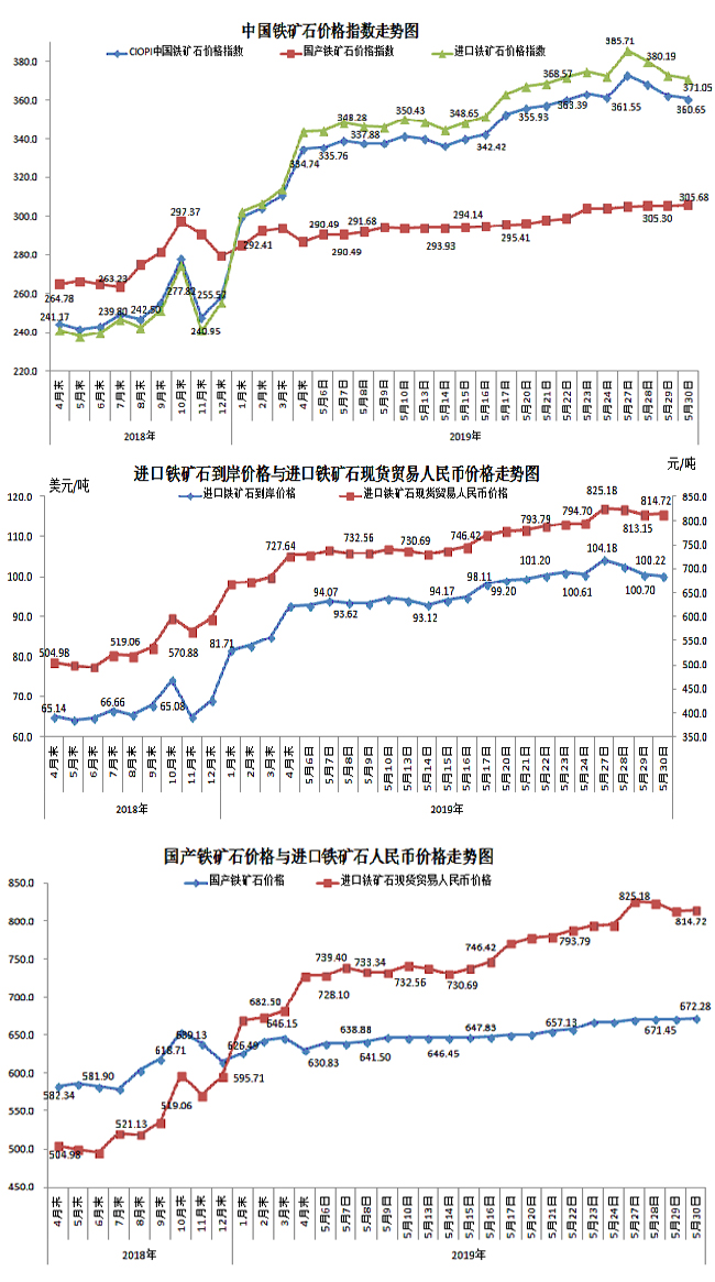 5月30日,中國鐵礦石價格指數(CIOPI)360.65點,環比下降1.43點,降幅為0.40%。其中:國產鐵礦石價格指數為305.68點,環比上升0.37點,升幅為0.12%;進口鐵礦石價格指數為371.05點,環比下降1.78點,降幅為0.48%。