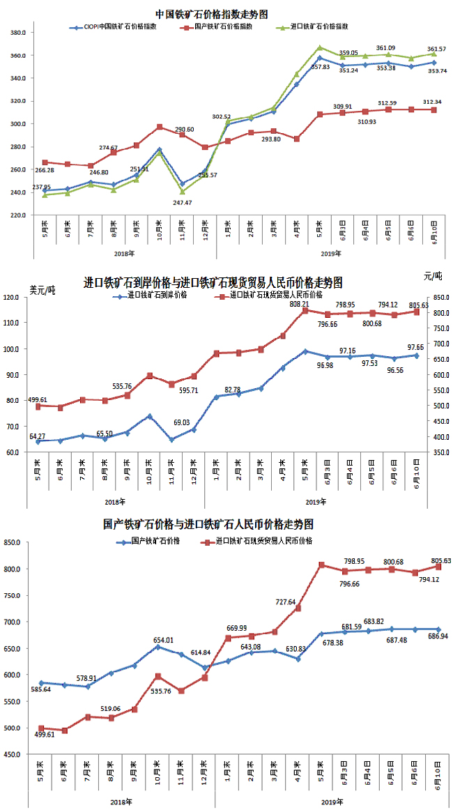 6月10日,中國鐵礦石價格指數(CIOPI)353.74點,環比上升3.40點,升幅為0.97%。其中:國產鐵礦石價格指數為312.34點,環比下降0.14點,降幅為0.04%;進口鐵礦石價格指數為361.57點,環比上升4.07點,升幅為1.14%。