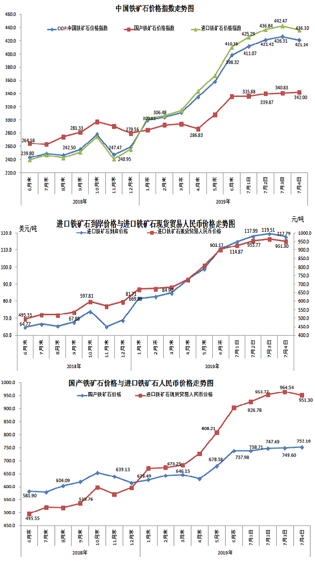 7月4日,中國鐵礦石價格指數(CIOPI)421.14點,環比下降5.17點,降幅為1.21%。其中:國產鐵礦石價格指數為342.00點,環比上升1.17點,升幅為0.34%;進口鐵礦石價格指數為436.10點,環比下降6.37點,降幅為1.44%。