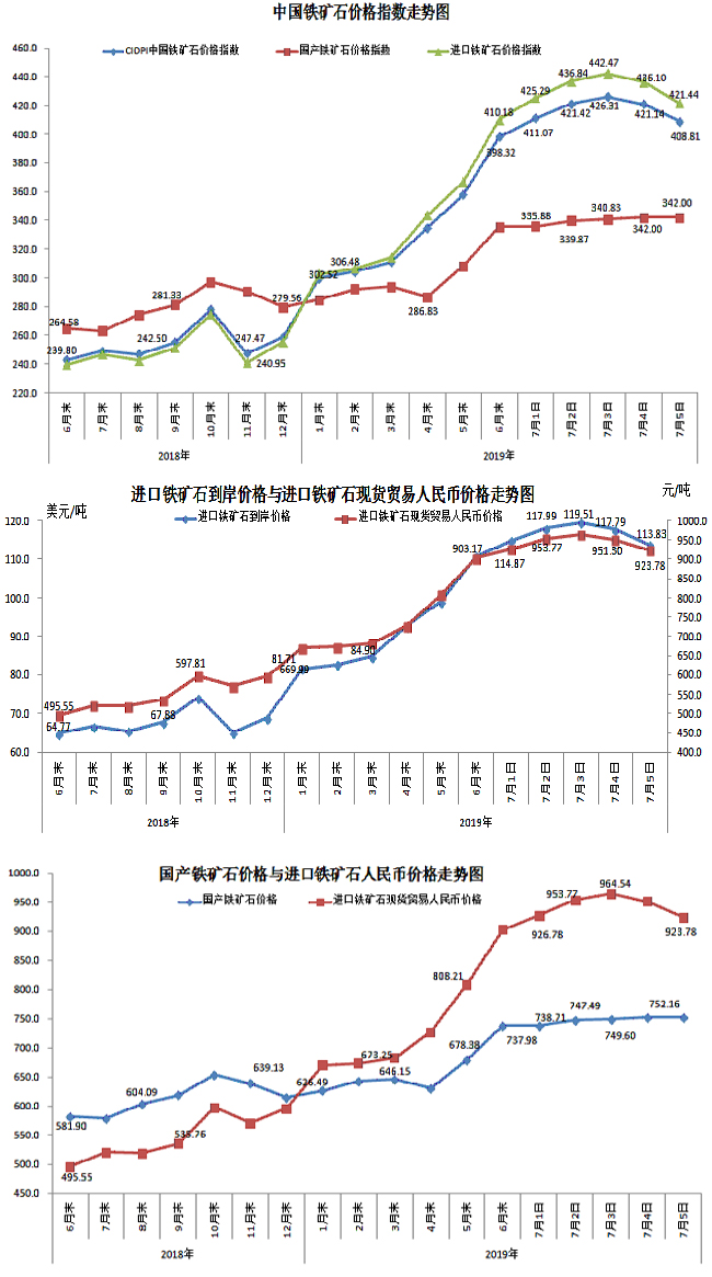 7月5日,中國鐵礦石價格指數(CIOPI)408.81點,環比下降12.33點,降幅為2.93%。其中:國產鐵礦石價格指數為342.00點,環比持平;進口鐵礦石價格指數為421.44點,環比下降14.66點,降幅為3.36%。