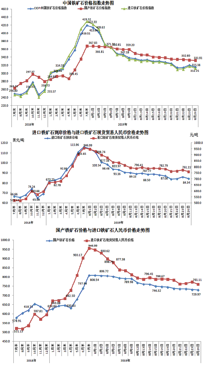8月26日,中國鐵礦石價格指數(CIOPI)315.38點,環比下降4.81點,降幅為1.50%。其中:國產鐵礦石價格指數為331.91點,環比下降0.89點,降幅為0.27%;進口鐵礦石價格指數為312.25點,環比下降5.55點,降幅為1.75%。