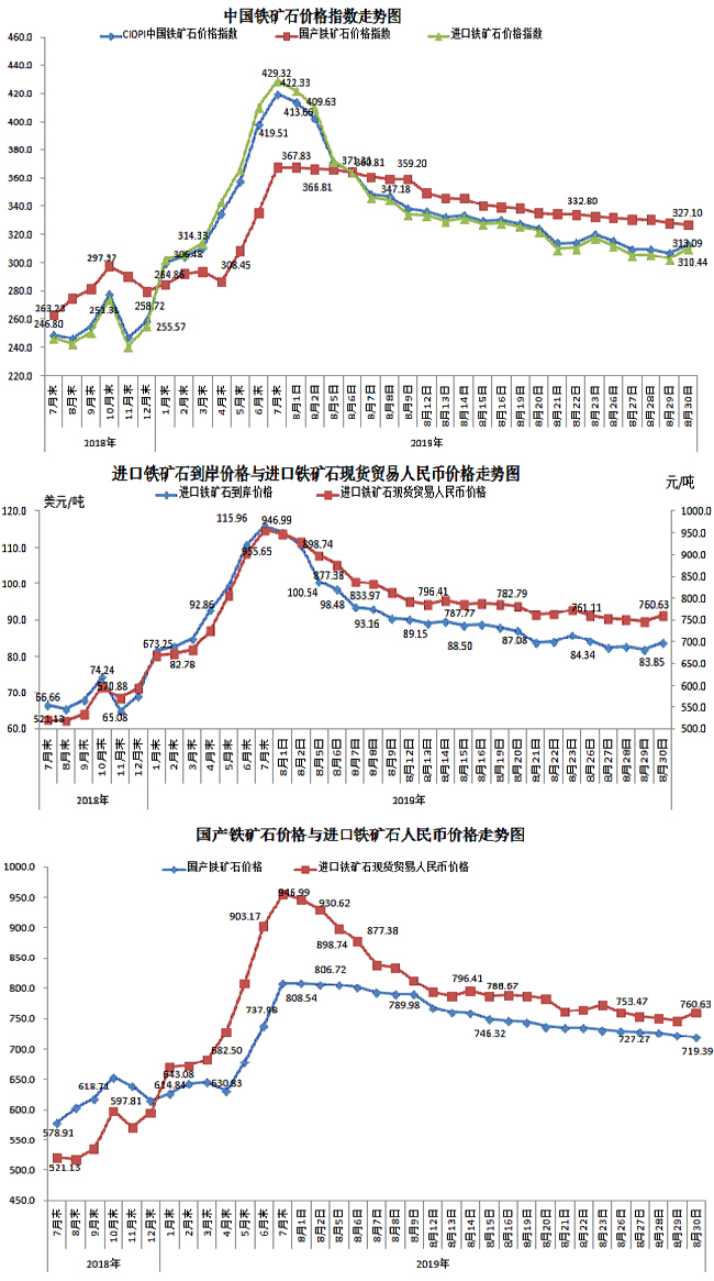 8月30日,現貨貿易進口鐵礦石62%品位幹基粉礦人民幣含稅價格為760.63元/噸,環比每噸上升13.73元,升幅為1.84%,當月平均價格為806.27元/噸。