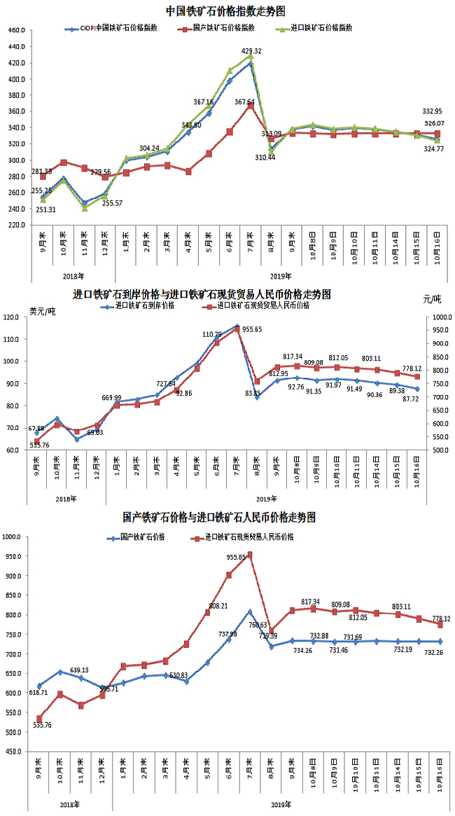 10月16日,中國鐵礦石價格指數(CIOPI)326.07點,環比下降5.17點,降幅為1.56%。其中:國產鐵礦石價格指數為332.95點,環比持平;進口鐵礦石價格指數為324.77點,環比下降6.15點,降幅為1.86%。