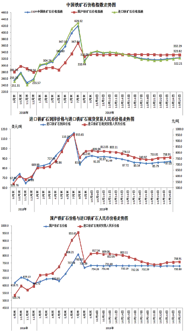 10月25日,中國鐵礦石價格指數(CIOPI)323.82點,環比上升2.40點,升幅為0.75%。其中:國產鐵礦石價格指數為332.29點,環比持平;進口鐵礦石價格指數為322.21點,環比上升2.85點,升幅為0.89%。