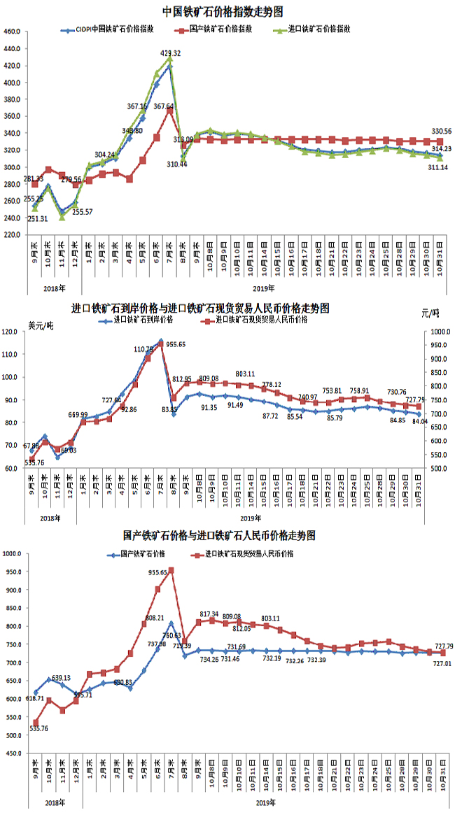 10月31日,中國鐵礦石價格指數(CIOPI)314.23點,環比下降2.52點,降幅為0.80%。其中:國產鐵礦石價格指數為330.56點,環比持平;進口鐵礦石價格指數為311.14點,環比下降3.00點,降幅為0.95%。