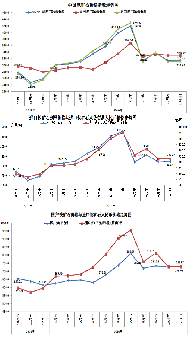 11月1日,中國鐵礦石價格指數(CIOPI)315.32點,環比上升1.09點,升幅為0.35%。其中:國產鐵礦石價格指數為330.37點,環比下降0.19點,降幅為0.06%;進口鐵礦石價格指數為312.48點,環比上升1.33點,升幅為0.43%。