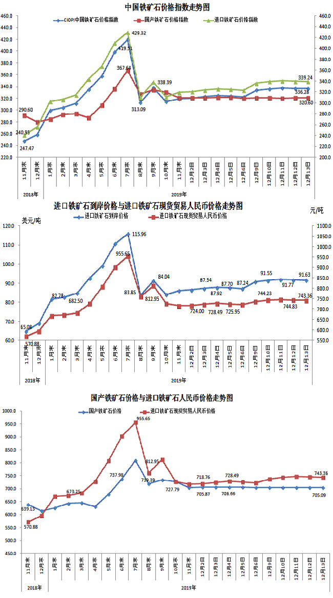 12月13日,中國鐵礦石價格指數(CIOPI)336.28點,環比下降0.44點,降幅為0.13%。其中:國產鐵礦石價格指數為320.60點,環比持平;進口鐵礦石價格指數為339.24點,環比下降0.52點,降幅為0.15%。