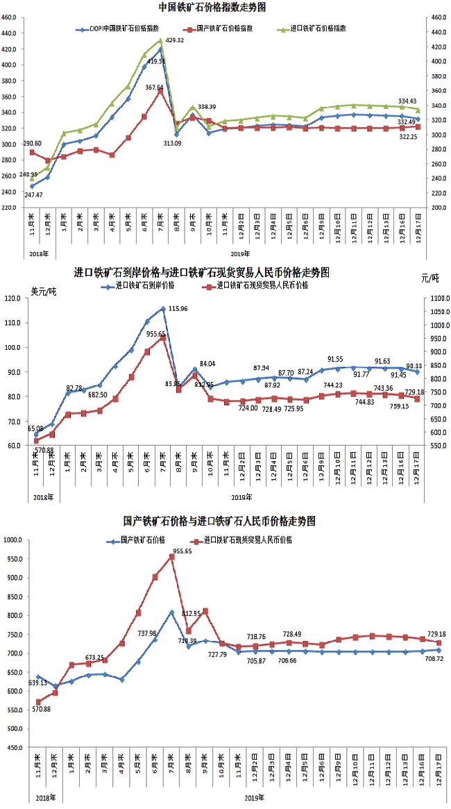 12月17日,中國鐵礦石價格指數(CIOPI)332.49點,環比下降3.30點,降幅為0.98%。其中:國產鐵礦石價格指數為322.25點,環比上升1.18點,升幅為0.37%;進口鐵礦石價格指數為334.43點,環比下降4.15點,降幅為1.22%。