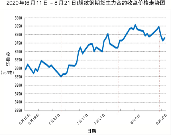 8月份,螺紋鋼主力合約價格繼續保持7月份上升之勢,輕鬆突破3800元/噸整數點關口。8月上旬和中旬,螺紋鋼主力合約的收盤價多在3800元/噸上下波動;最高價幾乎全部在3800元/噸以上運行,最高衝至3888元/噸。上周五(8月21日)收盤,螺紋鋼主力合約(RB2010)的收盤價、最高價和最低價與前一周末(8月14日)收盤時的對應價格相比,分別回落16元/噸、2元/噸和8元/噸;但與7月底相比,螺紋鋼主力合約的對應價格則分別上升6元/噸、20元/噸和42元/噸。螺紋鋼期貨主力合約最低價的明顯提升表明,盡管螺紋鋼期貨價格在8月中旬後期急劇下跌,但是在8月下旬,螺紋鋼期貨市場總體漲勢猶在。