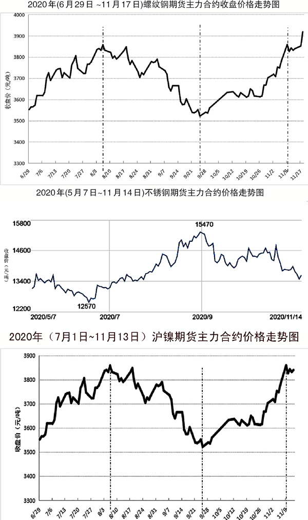 10月28日以來,不鏽鋼期貨價格出現高位急劇下跌,震蕩走低。11月首個交易日(11月2日),不鏽鋼主力合約收盤價、最高價和最低價分別為13805元/噸、14200元/噸和13805元/噸,較10月28日小高峰時對應的價位分別下跌970元/噸(跌幅6.57%)、725元/噸(跌幅4.86%)和305元/噸(跌幅2.16%)。之後,直至11月中,不鏽鋼期貨價格總體上一路震蕩走低,但下跌之勢有所減緩,甚至在周末時出現了小幅回升勢頭。截至11月14日(上周六)淩晨1時,不鏽鋼主力合約收盤價、最高價和最低價分別下降到13635元/噸、13700元/噸和13510元/噸,較11月2日的對應價位分別降低170元/噸(跌幅1.23%)、500元/噸(跌幅3.52%)和295元/噸(跌幅2.14%),但較上一交易日的對應價位則分別上漲1.07%、1.56%和0.15%。