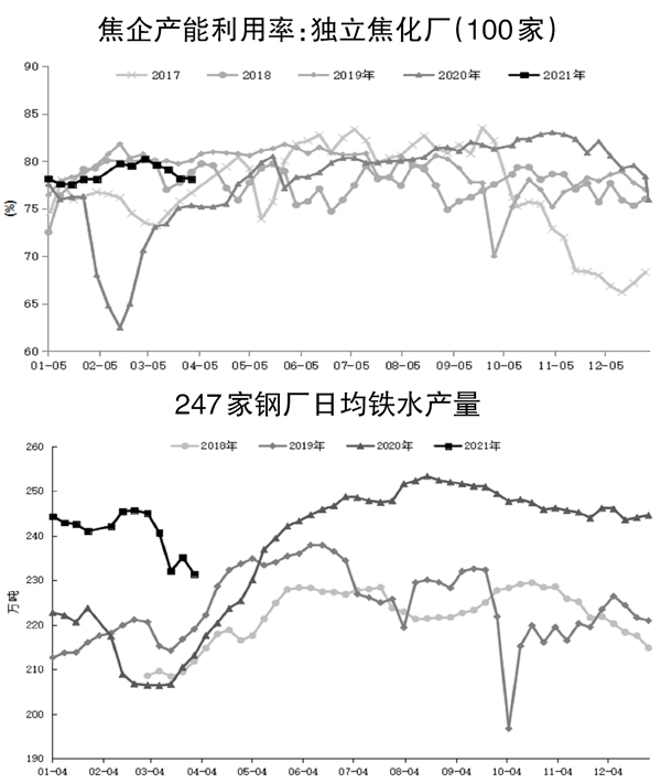 上周(3月29日~4月2日),焦炭期貨主力J2105合約價格延續3月24日以來的反彈走勢,焦價回升到2400元/噸附近,較低點反彈近300元/噸,焦價在整個第一季度持續下跌的趨勢有望被打破。現貨市場偏弱運行,第8輪調降逐步落地。至此,焦價自2月19日開啟調降周期以來,已連續下調8輪,累計跌幅800元/噸。上周五(4月2日),受期貨價格走強的帶動,現貨市場情緒回暖,山西省、河北省、山東省等主流市場焦企聯合開啟第1輪提漲,其中對幹熄焦價格上調110元/噸,對濕熄焦價格上調100元/噸,於4月6日起執行。
