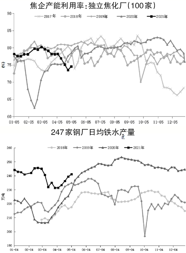 從需求端來看,自3月份河北省唐山市出台鋼廠全年環保限產政策後,當地鋼廠高爐開工、焦炭日耗等均出現明顯下降,焦炭需求快速走弱;jinqisuizhehebeishengtangshanshixianchanhuiguichangtaihua,qitadiquzanweichutaijiaoyandexianchanzhengce,bingqiezaixuqiuwangjideladongxia,gangcaijiagechixupansheng,gangchangyingliqingkuangjiaoweikeguan,dadacijileqitadiqugangchangdeshengchanjijixing,jinertuidongjiaotanxuqiuchixuhuisheng。shangzhouwu(5月7日)數據顯示,247家樣本鋼廠高爐日均鐵水產量由前期低點231萬噸持續回升至241萬(wan)噸(dun),高(gao)於(yu)往(wang)年(nian)同(tong)期(qi)。目(mu)前(qian)來(lai)看(kan),鋼(gang)材(cai)仍(reng)處(chu)於(yu)需(xu)求(qiu)旺(wang)季(ji)階(jie)段(duan),鋼(gang)廠(chang)高(gao)爐(lu)生(sheng)產(chan)暫(zan)時(shi)沒(mei)有(you)政(zheng)策(ce)阻(zu)力(li),日(ri)均(jun)鐵(tie)水(shui)產(chan)量(liang)有(you)望(wang)進(jin)一(yi)步(bu)增(zeng)加(jia),焦(jiao)炭(tan)需(xu)求(qiu)短(duan)期(qi)向(xiang)好(hao)。