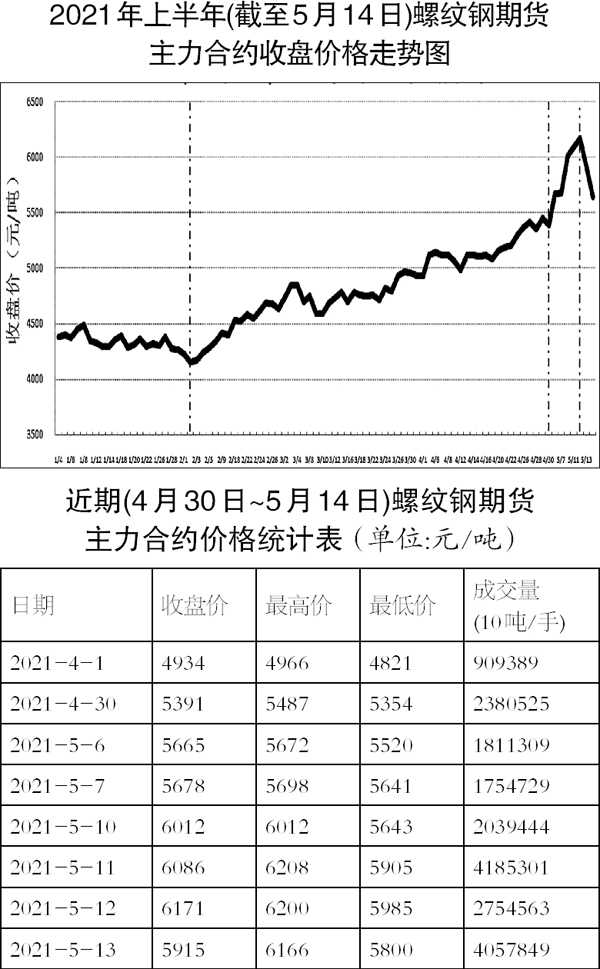 筆者觀察發現,4月份,螺紋鋼期貨主力合約收盤價、最高價和最低價的最高價格曾分別達到5452元/噸、5487元/噸和5362元/噸。“五一”假期過後,螺紋鋼期貨主力合約最高價進一步達到6208元/噸,創出曆史新高,較4月底上漲721元/噸(升幅為13.14%),較4月初上漲1242元/噸(升幅為25.01%);其收盤價最高達到6171元/噸,較4月底上漲780元/噸(升幅為14.47%),較4月初上漲1237元/噸(升幅為25.07%);其最低價最高達到5985元/噸,較4月底上漲631元/噸(升幅為11.79%),較4月初上漲1164元/噸(升幅為的24.14%)。而在5月份,螺紋鋼期貨價格“登峰造極”曆程隻有4~5個交易日。其價位之高,漲速之快,勢頭之猛,均刷新了曆史紀錄。
