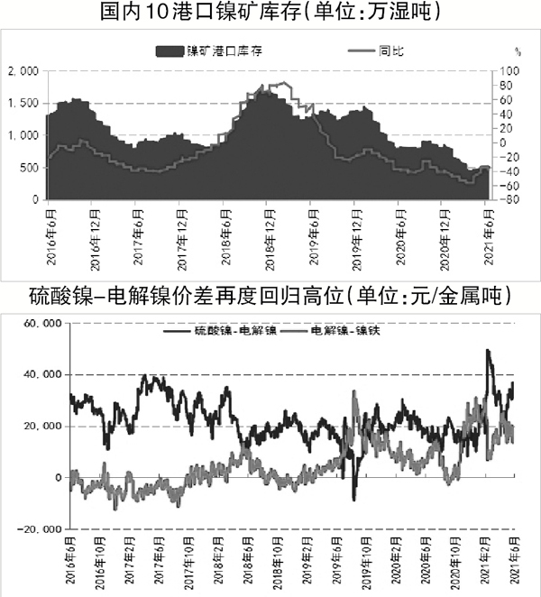 feilvbinyuankuanggongyingchaoyuqijinque。xiajiyilai,feilvbinxinguanfeiyanyiqingzaiduehua,gaiguoxinzengbinglilvchuangxingao,qizhongniekuangchanqubalawangshengshenzhixuanbujinruzainanzhuangtai,dangdichuanqidafuyanchang,daozhizhongguohongtuniekuangzengliangbujiyuqi。jiezhi6月18日,10地港口庫存僅剩502萬濕噸,同比減少37.21%,與原先預期的菲律賓雨季後的放量增加大相徑庭。此外,因全球貨運緊缺、集裝箱“一箱難求”,海運費飛漲導致鎳礦運輸成本高昂,推動礦價維持高位。截至6月21日,菲律賓1.5%紅土鎳礦CIF(到岸價格)均價為65美元/濕噸,與4月份鎳礦最為緊缺時的價格持平,支撐鎳鐵成本。