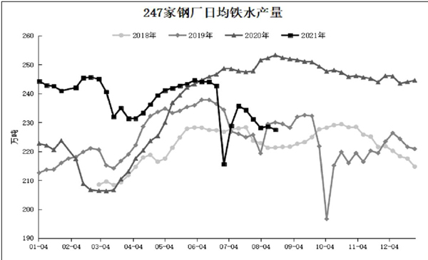 需求端,在粗鋼產量壓減的政策壓力下,各地鋼廠7月份陸續執行今年粗鋼產量同比不增或減少的措施,致使粗鋼、生鐵產量出現明顯下降。國家統計局數據顯示,7月份,我國粗鋼產量為8679萬噸,同比減少8.4%;生鐵產量為7285萬噸,同比減少8.9%;1月~7月份,粗鋼累計產量為64933萬噸,同比增長8.0%;生鐵累計產量為53350萬噸,同比增長2.3%。粗鋼、鐵水產量的下降也表明焦炭需求壓力在逐步增加。數據顯示,上周,247家鋼廠日均鐵水產量為227.52萬噸,較去年同期減少25.78萬噸,同時較上半年日均鐵水均值低13萬噸左右。目前,需求的下降在一定程度上緩解了焦炭供應偏緊的矛盾。