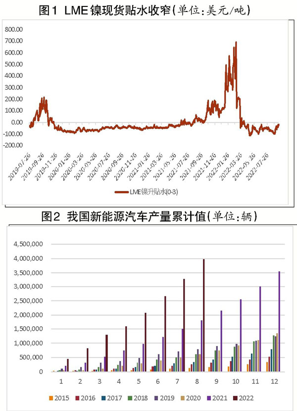 從鎳庫存變化情況來看,LME(倫敦金屬交易所)鎳庫存量持續下降。截至2022年9月16日,LME鎳庫存總量為51690噸,同比下降70%,較2021年末降低50.2%。近期歐洲倉庫倉單注銷量有所增加,現貨貼水持續收窄(見圖1)。鎳的低庫存狀態疊加供給端擾動,給鎳期貨價格造成的波動可能會持續存在。