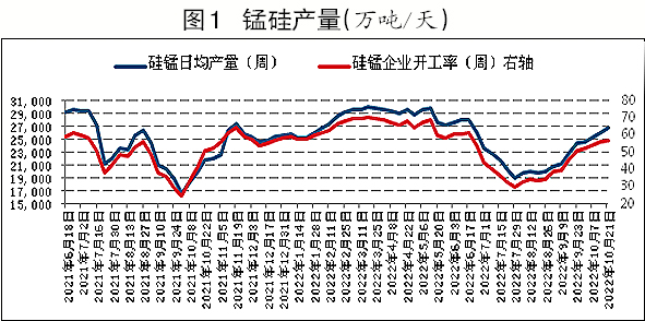 進入10月份以後,錳矽周度產量迅速攀升,但鋼材產量出現見頂回落的情況。