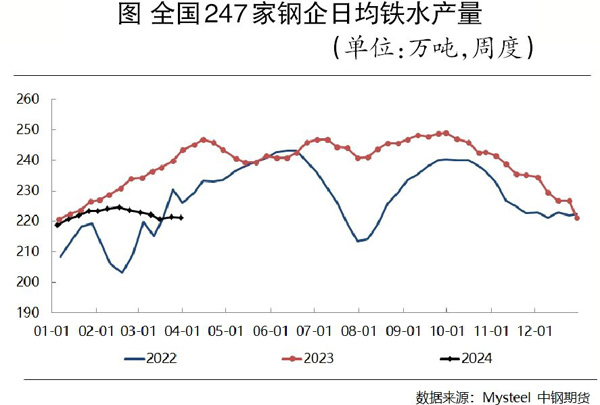 在(zai)需(xu)求(qiu)端(duan),鐵(tie)礦(kuang)石(shi)需(xu)求(qiu)回(hui)升(sheng)速(su)度(du)明(ming)顯(xian)慢(man)於(yu)往(wang)年(nian)同(tong)期(qi)。當(dang)前(qian)國(guo)內(nei)長(chang)流(liu)程(cheng)鋼(gang)企(qi)複(fu)產(chan)力(li)度(du)不(bu)及(ji)預(yu)期(qi),鋼(gang)企(qi)利(li)潤(run)不(bu)佳(jia)嚴(yan)重(zhong)影(ying)響(xiang)後(hou)續(xu)複(fu)產(chan)積(ji)極(ji)性(xing),進(jin)而(er)抑(yi)製(zhi)國(guo)內(nei)鐵(tie)礦(kuang)石(shi)需(xu)求(qiu),下(xia)遊(you)實(shi)際(ji)需(xu)求(qiu)釋(shi)放(fang)速(su)度(du)緩(huan)慢(man)且(qie)鋼(gang)企(qi)的(de)生(sheng)產(chan)利(li)潤(run)難(nan)有(you)明(ming)顯(xian)的(de)改(gai)善(shan)。自(zi)2024年初以來,鋼企日均鐵水產量持續處於225萬噸以下的低位水平,全國247家樣本鋼企盈利麵持續小於30%。從鋼企的複產計劃來看,4月份仍有大量鋼企集中複產,預計日均鐵水產量將恢複至230萬噸~235萬噸水平。但目前鋼企利潤水平仍然偏低且終端需求恢複緩慢,鐵水產量存在不及預期的風險。