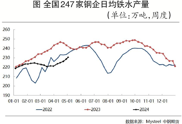 在(zai)需(xu)求(qiu)端(duan),需(xu)求(qiu)端(duan)將(jiang)繼(ji)續(xu)主(zhu)導(dao)價(jia)格(ge)走(zou)勢(shi),短(duan)期(qi)內(nei)需(xu)求(qiu)仍(reng)將(jiang)保(bao)持(chi)增(zeng)加(jia)態(tai)勢(shi)。鋼(gang)企(qi)盈(ying)利(li)麵(mian)回(hui)升(sheng)至(zhi)中(zhong)位(wei)偏(pian)高(gao)水(shui)平(ping),鐵(tie)水(shui)產(chan)量(liang)加(jia)速(su)回(hui)升(sheng),鋼(gang)企(qi)在(zai)盈(ying)利(li)率(lv)好(hao)轉(zhuan)的(de)情(qing)況(kuang)下(xia),複(fu)產(chan)積(ji)極(ji)性(xing)增(zeng)加(jia),鋼(gang)企(qi)日(ri)耗(hao)呈(cheng)現(xian)逐(zhu)步(bu)走(zou)高(gao)趨(qu)勢(shi),國(guo)內(nei)鐵(tie)礦(kuang)石(shi)需(xu)求(qiu)繼(ji)續(xu)回(hui)升(sheng)的(de)預(yu)期(qi)仍(reng)然(ran)存(cun)在(zai)。截(jie)至(zhi)4月26日,全國247家鋼企盈利麵為50.65%,環比擴大2.17個百分點,日均鐵水產量環比回升2.50萬噸至228.72萬噸。數據顯示,2024年1月—3月份,我國生鐵產量為20241.7萬噸,同比減少2.97%。