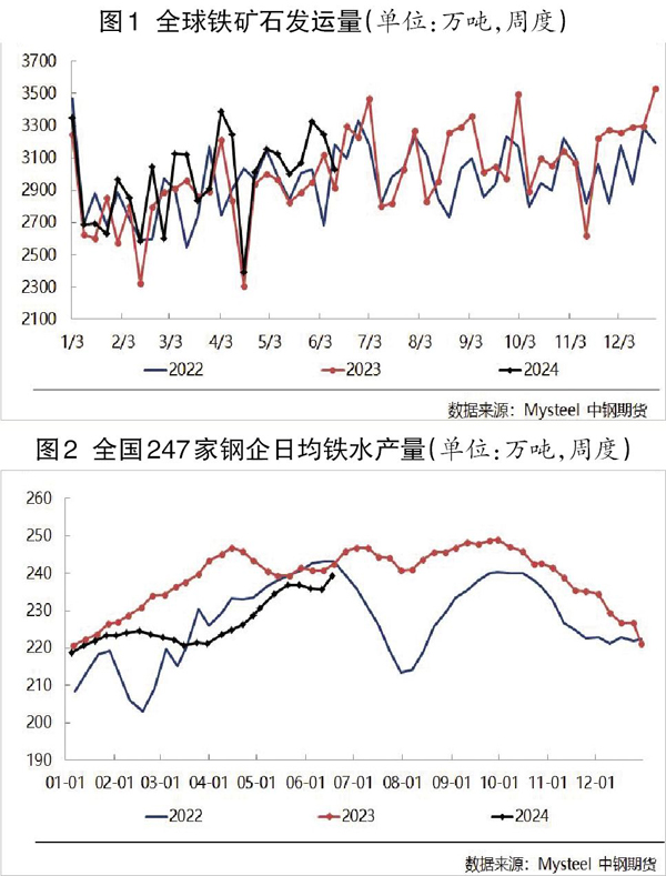 供應方麵,主流礦山及非主流礦山發運量同比增加態勢不變。第2季度屬於主流礦山傳統發運回升周期,其中必和必拓和FMG礦山財年目標的完成度偏低,6月份存在衝量任務。近期全球鐵礦石發運量連續8周維持在3000萬噸以上且處於近3年同期高位,發運量仍處於回升周期,目前6月份全球鐵礦石發運量周均值為3265.5萬噸,同比增加196.5萬噸;非主流礦發運量周均值為557萬噸,同比增加135萬噸。同時,今年到港量整體高於去年同期水平,且今年中國到港量保持較快增速。據調研,截至6月17日,全國45港到港量累計增加4341萬噸,同比增長7.2%。