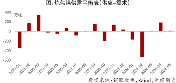 2024年1月—5月份,國內煉焦精煤產量為18710萬噸,同比減少2019萬噸;煉焦煤進口量為4752萬噸,同比增加1007萬噸;煉焦煤供應量為23462萬噸,同比減少1012萬噸;煉焦煤出口量為30萬噸,同比增加21萬噸;焦炭產量為19947萬噸,同比減少366萬噸。煉焦煤供需平衡表顯示,1月—2月份煉焦煤供應持續短缺,3月—5月份供應短缺緩解,轉向供需平衡與供應過剩,合計1月—5月份煉焦煤供應短缺505萬噸。