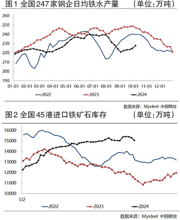 需求端對價格更多起到支撐作用,難以提供向上驅動力。據相關機構調研,2024年1月—9月份,全國247家鋼企生鐵產量為6.26億噸,同比下降2932.4萬噸,降幅為4.47%,日均鐵水產量為229.4萬噸,折算鐵礦石需求減量為4692萬噸。