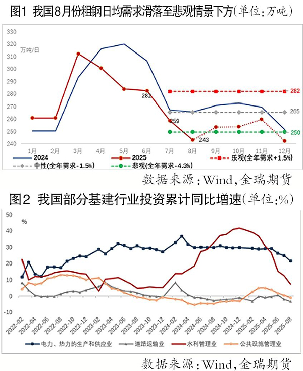 在基建前三大子行業中,1月—8月份,電力、熱力的生產和供應業投資累計同比增長21.6%,增速自6月份開始加速放緩;公共設施管理業投資和道路運輸業投資分別累計同比減少1.1%和3.3%,成為基建粗鋼消費的主要拖累項。另外,筆者觀察到,今年初以來水利管理業投資增速持續放緩,1月—8月份累計同比增長7.4%,自2024年以來增速持續兩位數增長後回落至個位數,或意味著始於2023年第4季度增發萬億元國債支持的水利基建投資進入收尾階段。預計在缺乏增量政策注入的背景下,第4季度基建粗鋼消費難樂觀。
